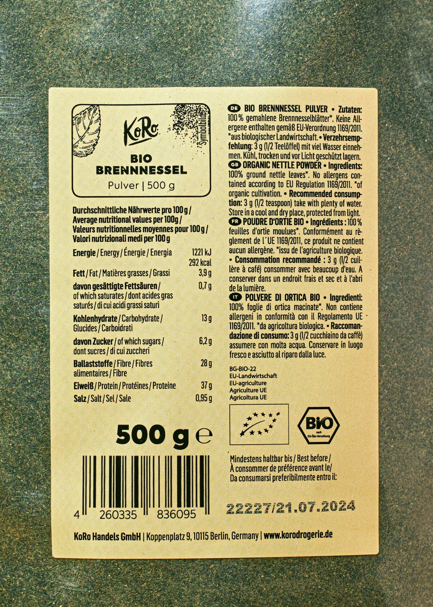 Weltweit gibt es ca. 30 bis 70 verschiedene Arten der Brennnessel. Insbesondere in Europa und Asien fühlt sich die Wildpflanze pudelwohl. Unser Brennnessel-Pulver stammt aus Bulgarien, aus ökologischem Anbau. Nach dem Ernten werden die Pflanzen schonend getrocknet und anschließend pulverisiert. Unser Brennnessel-Pulver ist eine natürliche und willkommene Abwechslung zu herkömmlichen Eiweißpulver-Mischungen, verleiht Deinen Gerichten eine ausgefallen grüne Note und brennt Dir garantiert nicht die Geschmacksknospen weg. Bio Brennnessel Pulver jetzt kaufen!