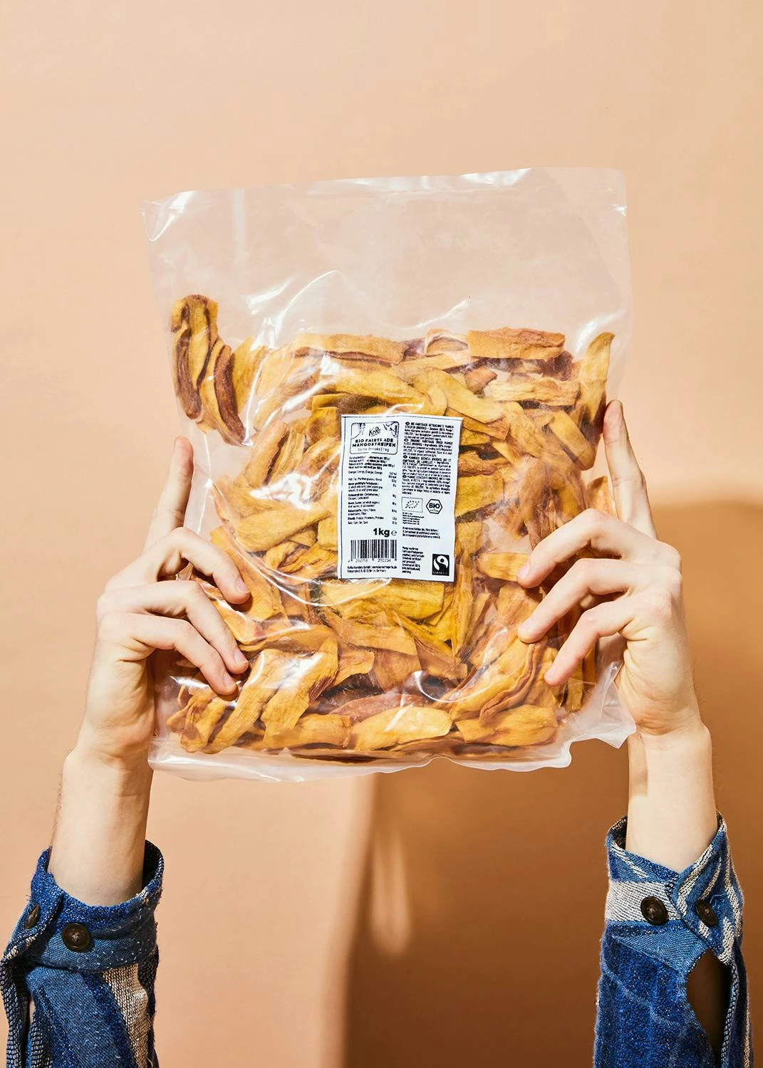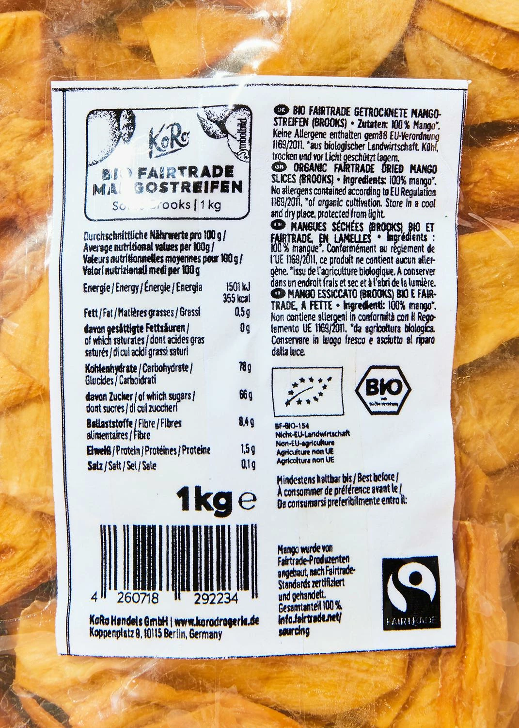 Was wir brauchen, um Dir Deinen Lieblings-Snack zu schneidern? Mangos bester Qualität! Und die haben wir nach vielen Taste-Tests in Burkina Faso gefunden, von wo wir unsere Mangostreifen auf direktem Weg beziehen. Dort werden sie nach der Ernte in Streifen geschnitten und schonend getrocknet. Wie genau wir unsere Früchte trocknen, kannst Du übrigens in unserem Blogartikel “Wie werden getrocknete Früchte hergestellt?” nachlesen. Üblicherweise würden die frischen Früchte sich nach der Ernte über viele Zwischenstationen auf den Weg in Deinen Supermarkt machen, und dabei in immer neue Gewänder, äh Verpackungen, gesteckt werden. Wir bei KoRo halten das aus ökologischer, ökonomischer und prozessorientierter Sicht für sinnlos. Darum lassen wir unsere Bio Mangos noch in Burkina Faso luftdicht verpacken, mit KoRo-Labels etikettieren und von dort aus ohne Umwege in unser Berliner Lager transportieren. Die Kostenersparnisse die wir durch das Überspringen von Handelsstufen erzielen, nutzen wir für die faire Bezahlung unserer Partner-Landwirt:innen und geben wir an Dich weiter.