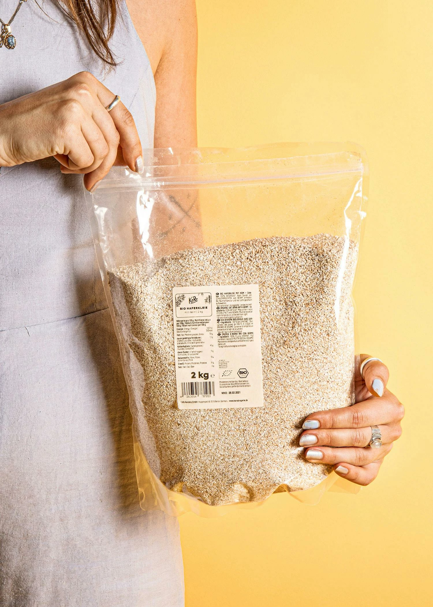 Wir müssen zugeben, Haferkleie klingt nicht so sexy und hat vielleicht vom Aussehen her kein Star-Appeal – ABER die inneren Werte zählen und mit denen überzeugt unsere Haferkleie auf jeden Fall: Mit 11 g Ballaststoffen auf 100 g hat die Haferkleie einen hohen Ballaststoffgehalt. Sportskanonen und Bizeps-Verliebte wird es freuen, denn Haferkleie ist zudem eine Proteinquelle (15 g/100 g) und Protein trägt zur Erhaltung normaler Knochen bei. Fakt ist auch: Protein trägt zu einem Wachstum der Muskelmasse bei. Wenn wir das hören, essen wir gleich noch lieber unser morgendliches Porridge mit unserer Haferkleie und lasse ihn mit Haferdrink und einem Löffel Nussmus extra cremig werden.