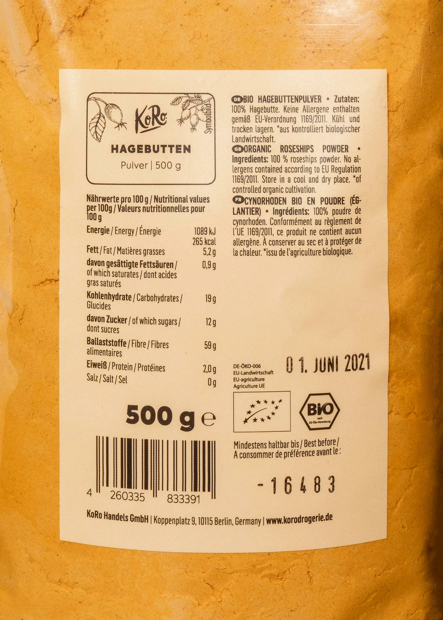 Das rötliche Pulver ist optisch und geschmacklich ein echtes Highlight in Deiner Küche. Und als wäre das nicht schon genug, ist es mit 129 mg Vitamin C pro 100 g teilentöltes Bio Hagebuttenpulver auch eine klasse Vitamin C-Quelle. Vitamin-C trägt zur normalen Funktion des Immunsystems bei. Falls nicht anders verordnet, empfehlen wir Dir, eine tägliche Dosierung von 2 Teelöffeln nicht zu überschreiten. Es gibt zahlreiche Rezepte, in die Du unser teilentöltes Bio Hagebuttenpulver aus Hagebuttensamen und -schalen integrieren kannst. Jetzt stell Dir mal vor, was für ein einzigartiger Hingucker rötliches Hagebuttenpulver in einem grünen Smoothie oder einer Smoothie-Bowl, im Joghurt, im Quark oder in einer bunten Müsli- bzw. Oatmeal-Bowl ist. Du kannst das fruchtige Hagenbuttenpulver aber auch wunderbar in Säfte einrühren und trinken oder auf Dein Frühstücks-Toast mit Marmelade streuen – für einen farbenfrohen, fruchtigen Start in den Tag.