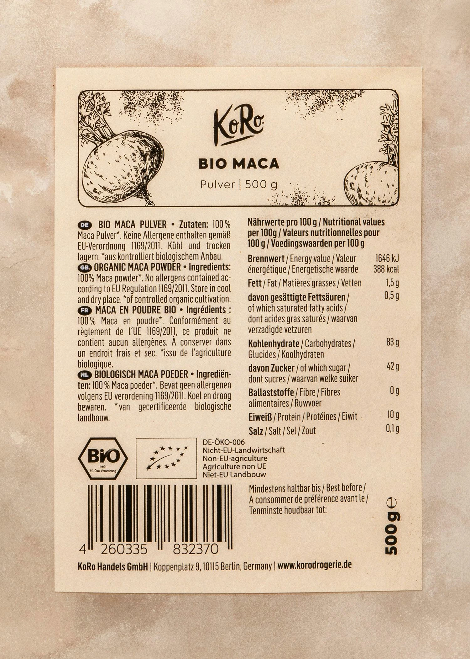 Wir haben für Dich die Knolle aus ihrer Heimat Peru in unser Sortiment aufgenommen. Bio und vegan – unser Maca-Pulver schließt niemanden aus! Und als wäre das noch nicht genug, ist unser Maca-Pulver auch noch eine Proteinquelle (11 g/100 g) und überzeugt mit einem hohen Ballaststoffgehalt (19 g/100 g). Wir sind verliebt! Schnapp auch Du Dir Deine Portion Maca-Pulver in der praktischen 500 g-Vorteilspackung und mache aus Deinem Zuhause eine Liebeshöhle. Beachte jedoch, die tägliche Verzehrsempfehlung von 6 g nicht zu überschreiten.