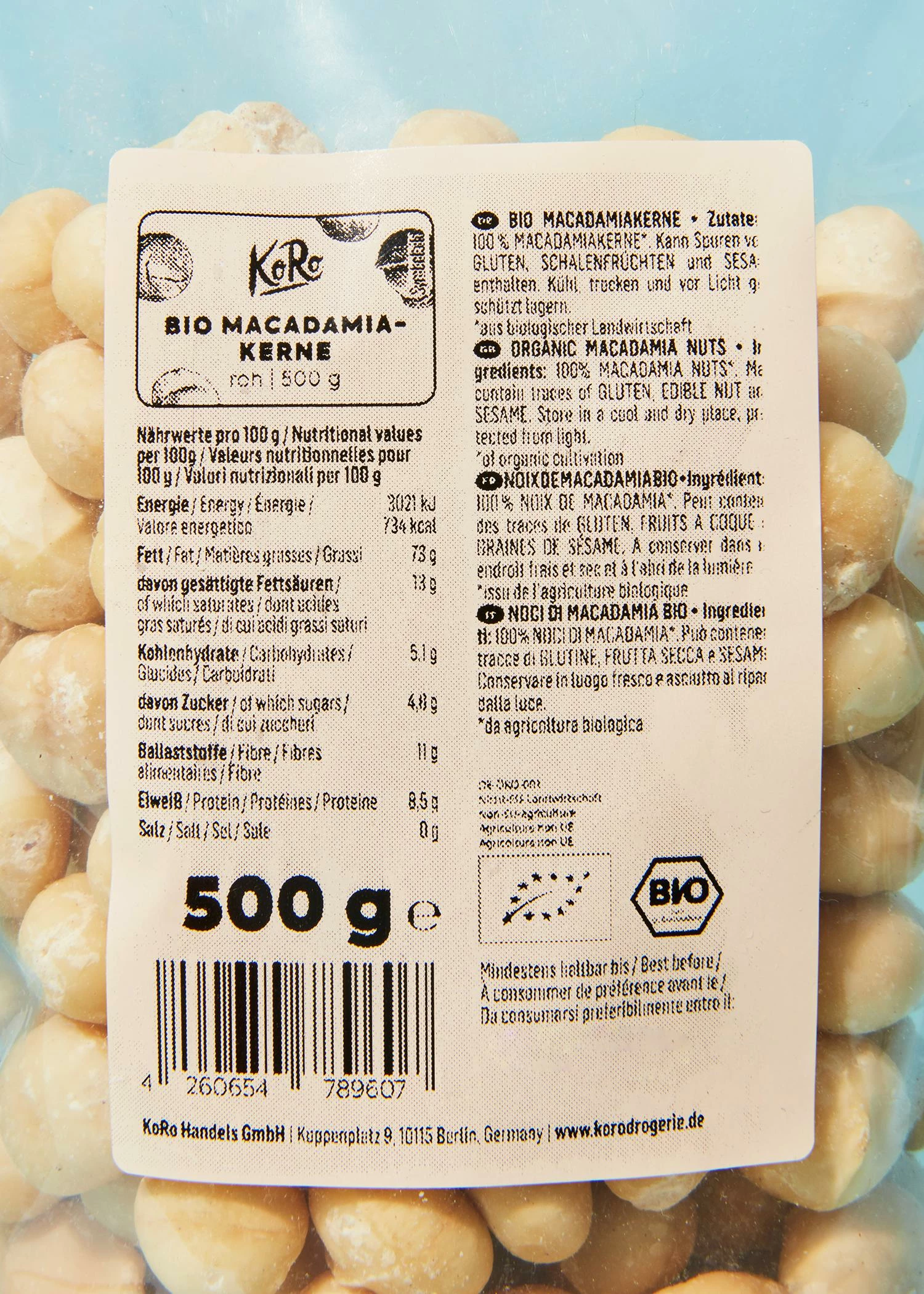 Unsere Bio Macadamia Kerne sind frei von jeglichen Zusätzen, wie Öl oder Salz. Durch die sorgfältige Auswahl der – unserer Ansicht nach – besten Macadamianüsse, können wir sicherstellen, dass diese keinen ranzigen Nachgeschmack entfalten, wie viele andere Macadamianüsse. Vielmehr entwickeln unsere Kerne ihr mild-buttriges Aroma in Deinem Gaumen. Einmal probiert, werden unsere Macadamianüsse mit Sicherheit ein fester Bestandteil Deiner Ernährung sein. Und damit tust Du Dir auch noch was Gutes – Macadamianüsse gelten als Ballaststoffquelle und sind daher ein wichtiger Bestandteil einer ausgewogenen Ernährung. Als sei das noch nicht genug, beziehen wir unsere Macadamianüsse auch noch aus biologischer Landwirtschaft.