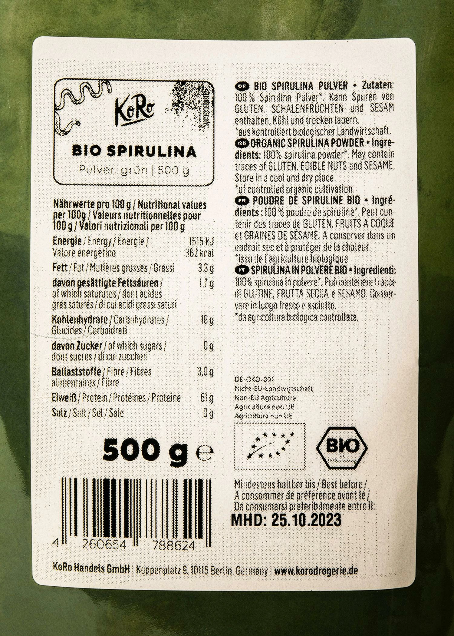 Ja, Du hast Richtig gehört. Die Spirulina-Alge ist trotz ihrer grünen Farbe biologisch gesehen ein Cyanobakterium. Unser Bio Spirulina-Pulver schmeckt leicht nach Alge und kann auch dazu verwendet werden, zahlreiche Gerichte natürlich grün einzufärben. Grundsätzlich empfehlen wir, täglich nicht mehr als 1-2 Teelöffel (circa 3-5 g) zu konsumieren. Wenn Du Deinem Smoothie und Deinen Desserts einen besonderen schimmernden blauen Touch verleihen möchtest, solltest Du auch einen Blick auf unsere blauen Spirulina-Tabletten werfen.