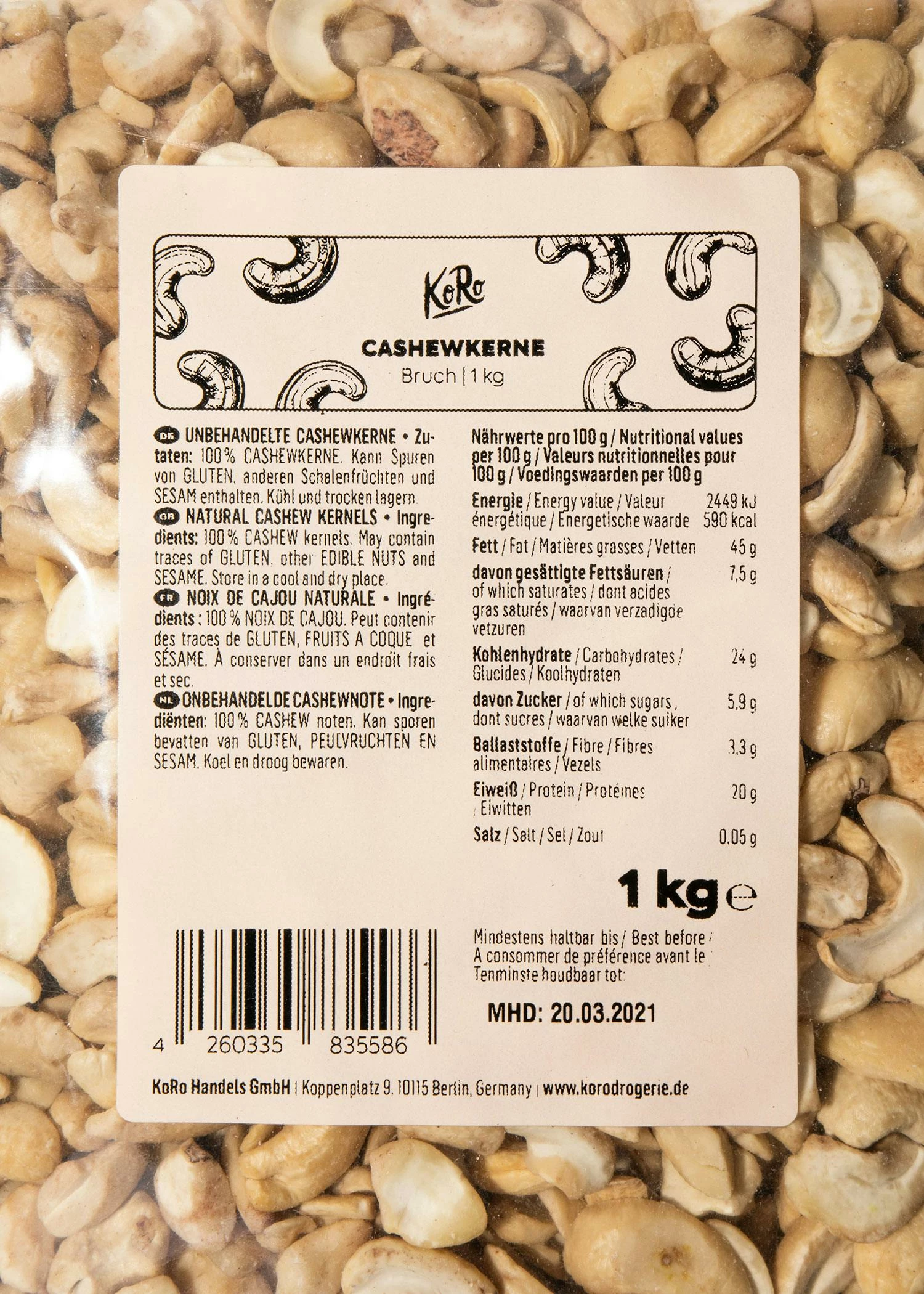 Cashews gehören zu den beliebtesten Nüssen. Botanisch gesehen sind Cashews aber gar keine Nüsse, sondern Kerne. Unsere Partner ernten Deine Cashews in Vietnam. Nachdem sie den Cashewapfel vom „Stiel“ entfernt haben, befreien sie den Kern von der Nuss-Hülle. Schon hält man den Cashewkern in den Händen. Krass oder? Und weil es eine ziemlich harte Nuss ist, ist das Öffnen gar nicht so leicht. Beim Knacken der Nussschale entsteht deshalb neben den ganzen Kernen, auch der sogenannte Cashewbruch. Dein KoRo Cashewbruch gehört zur LP Bruchware. LP was? LP steht für Large Pieces Bruchware und enthält nur gebrochene Cashews, die größer als 4,65 mm sind. Bei uns kommen daher nur große Stückchen des Cashewbruchs in die Großpackung! Wir stehen für Transparenz und wollen Dir auch Produkte anbieten, die Dich mit ihren inneren Werten so richtig begeistern. Dein Cashewbruch kann vereinzelt dunkle Ränder aufweisen – dies ist aber kein Qualitätsmangel, sondern ist auf Witterungsbedingungen zurückzuführen. Wir wollen Dir mit diesem Produkt eine weitere leckere und preisgünstige Alternative anbieten. Schließlich wäre es doch schade, wenn wir alle nur ganze Cashewkerne kaufen, wobei unser Cashewbruch mindestens genauso gut schmeckt. Qualität steht natürlich an erster Stelle, deshalb ist auch dieses Produkt frei von Zusätzen wie Zucker, Salz und Öl und sorgt so für ein natürliches und knackiges Geschmackserlebnis.