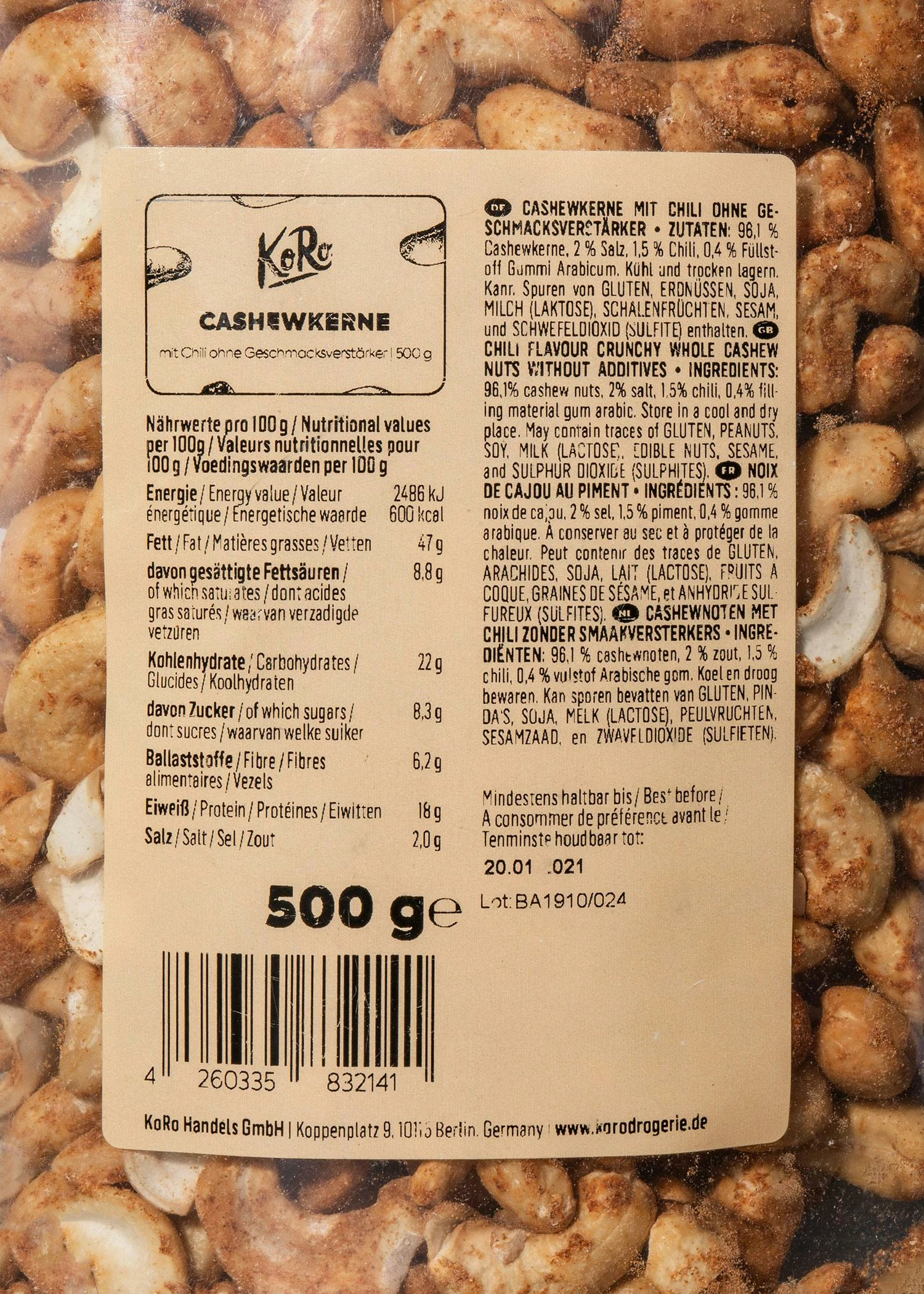 Bei KoRo kannst Du immer etwas dazulernen: Wusstest Du, dass die beliebte Cashew botanisch gesehen gar keine Nuss ist? Cashewkerne entstammen nämlich dem Cashew-Apfel, der als Steinobst am Baum wächst. Nun aber zu den noch wichtigeren Fakten: Neben ungesalzenen Premium Cashewkernen, Cashewbruch, gesalzenen und gerösteten Cashewkernen und extra cremigem Cashewmus, findest Du auch würzige Varianten in unserem Shop, wie Toskana- und Curry-Cashewkerne und jetzt auch Chili-Cashews ohne Geschmacksverstärker. Jetzt kaufen und puren Knabberspaß nach Hause liefern lassen!