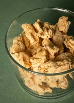 Erbsenprotein Schnetzel: Das bedeutet in unserem Fall, dass wir eine Inhaltsliste mit genau einer Zutat haben: gelben Erbsen. Letztendlich geht es nur darum, die perfekte bissfeste Konsistenz zu kreieren. Dafür wird Erbsenproteinkonzentrat texturiert. Klingt kompliziert, ist es aber gar nicht. Um Erbsenproteinkonzentrat herzustellen, werden unsere gelben Erbsen gemahlen und gepresst. Anschließend wird das feine Pulver unter Druck in die richtige Form gepresst. Das war’s – kein Schnickschnack, dafür 61 Gramm Protein je 100 Gramm und unzählige Verwendungsmöglichkeiten.