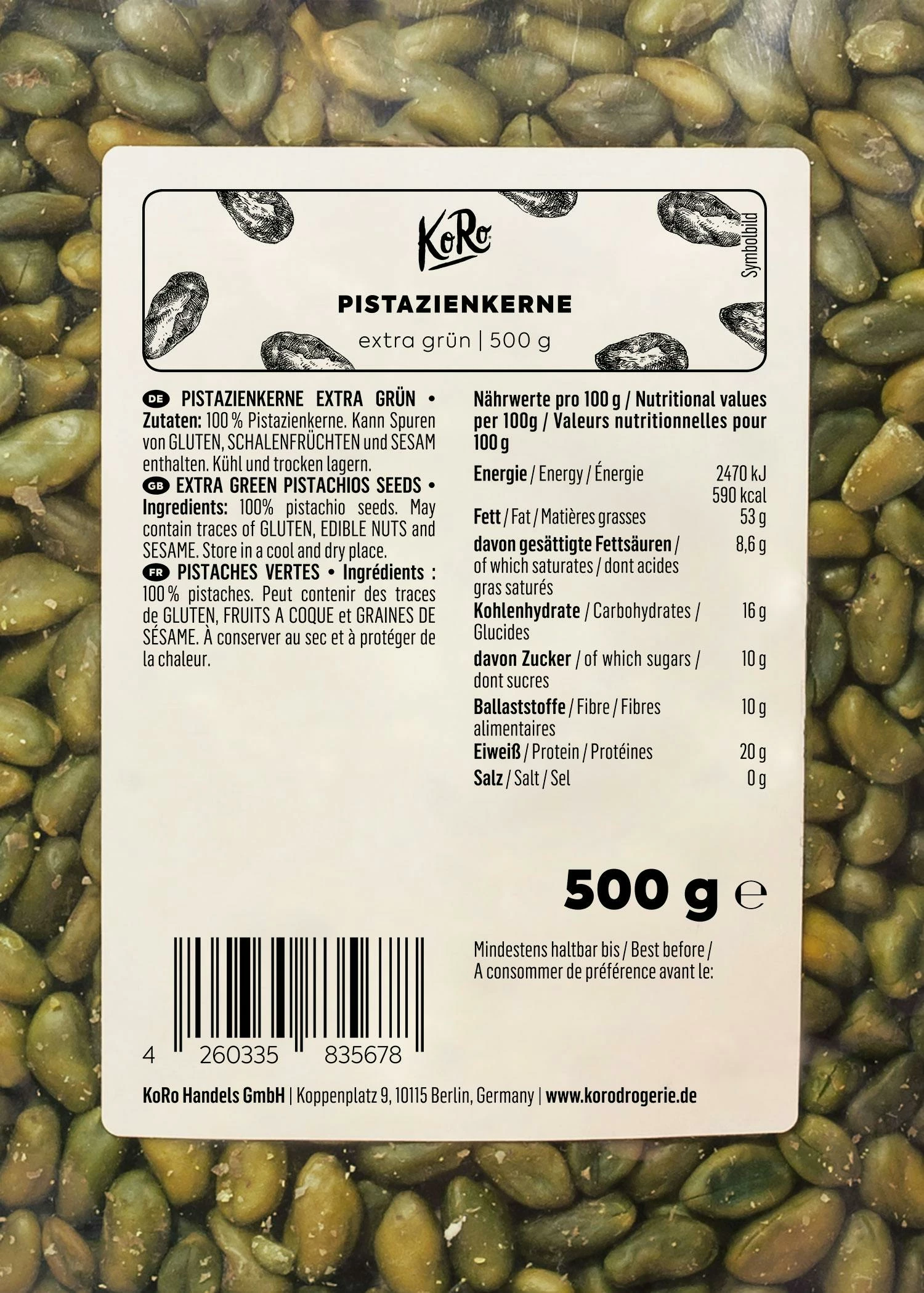 Der Postbote klingelt und Du kannst es nicht abwarten, die KoRo-Packung aufzureißen und los zu snacken? Wir kennen’s! Deshalb bekommst Du bei uns den nussig-würzigen Snack direkt geschält. Denn seien wir mal ehrlich: So haben wir unsere Pistazienkerne doch am liebsten! Unsere Pistazienkerne extra grün zeichnen sich durch ihre besonders kräftige Grünfärbung aus. Sie sind handverlesen und haben ein einmaliges Aroma – ganz ohne Zusätze! Unsere Pistazienkerne haben dazu einen hohen Ballaststoffgehalt (6,1 g/100 g) und schmecken himmlisch nussig, würzig und knackig – halt die perfekte Kombi. Worauf wartest Du? Kauf Dir jetzt Deine Portion grüne Pistazienkerne und snacke drauf los!