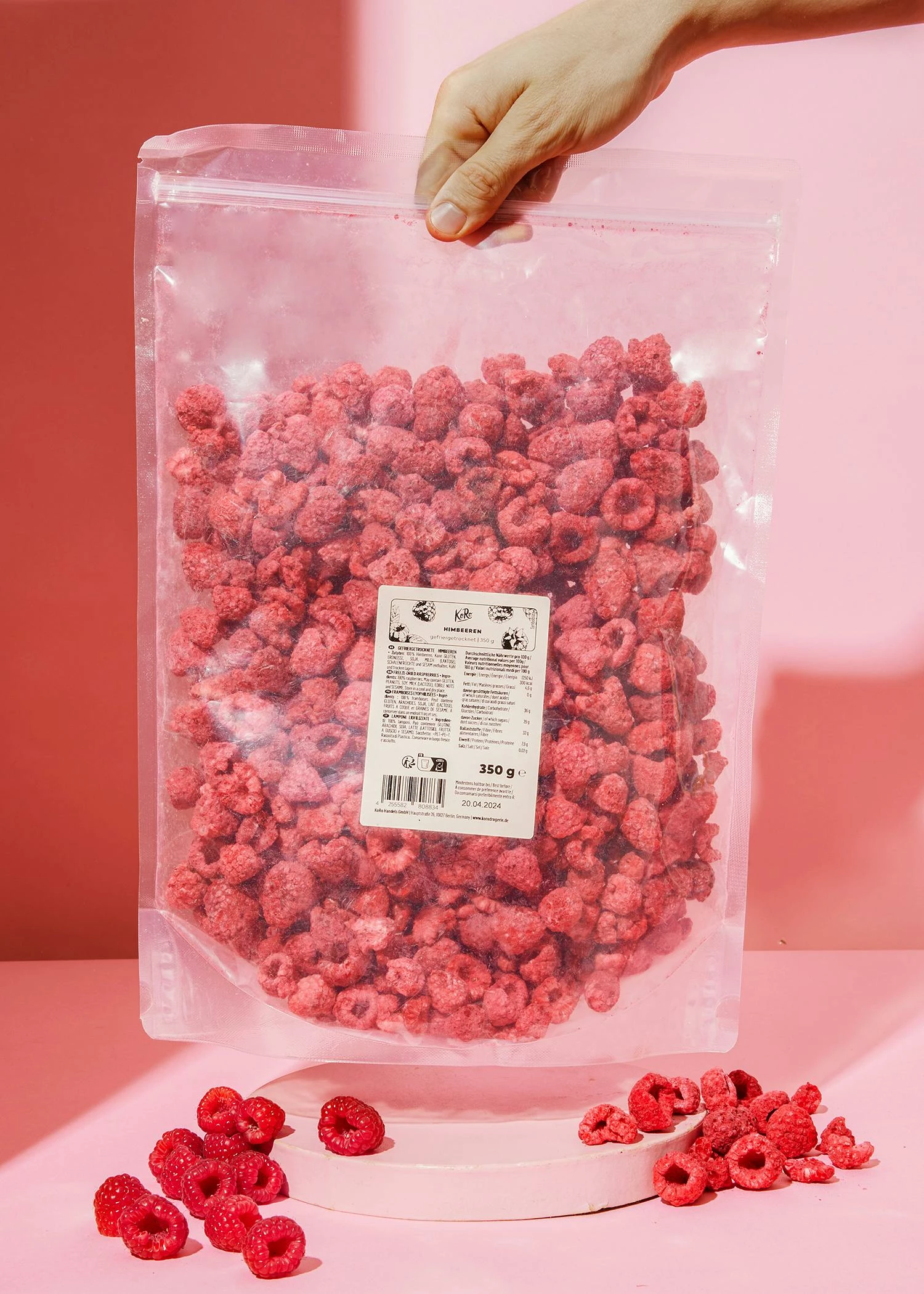 Was hat es mit dieser Gefriertrocknung eigentlich auf sich? Die reifen Früchte werden zunächst eingefroren und der sogenannten Sublimation unterzogen. Bei diesem Prozess wird den tiefgefrorenen Früchten in einer Vakuumkammer das Wasser entzogen, welches aus dem gefrorenen Zustand heraus direkt zu Dampf wird. Durch dieses schonende Trocknungsverfahren bleiben das Aroma und die Vitamine der Lebensmittel besonders gut erhalten. Auch die Himbeeren von KoRo überzeugen mit fruchtig-süßem Geschmack und ihrer angenehmen Knusprigkeit. Bestelle jetzt unsere gefriergetrockneten Himbeeren in der 350 g-Packung!