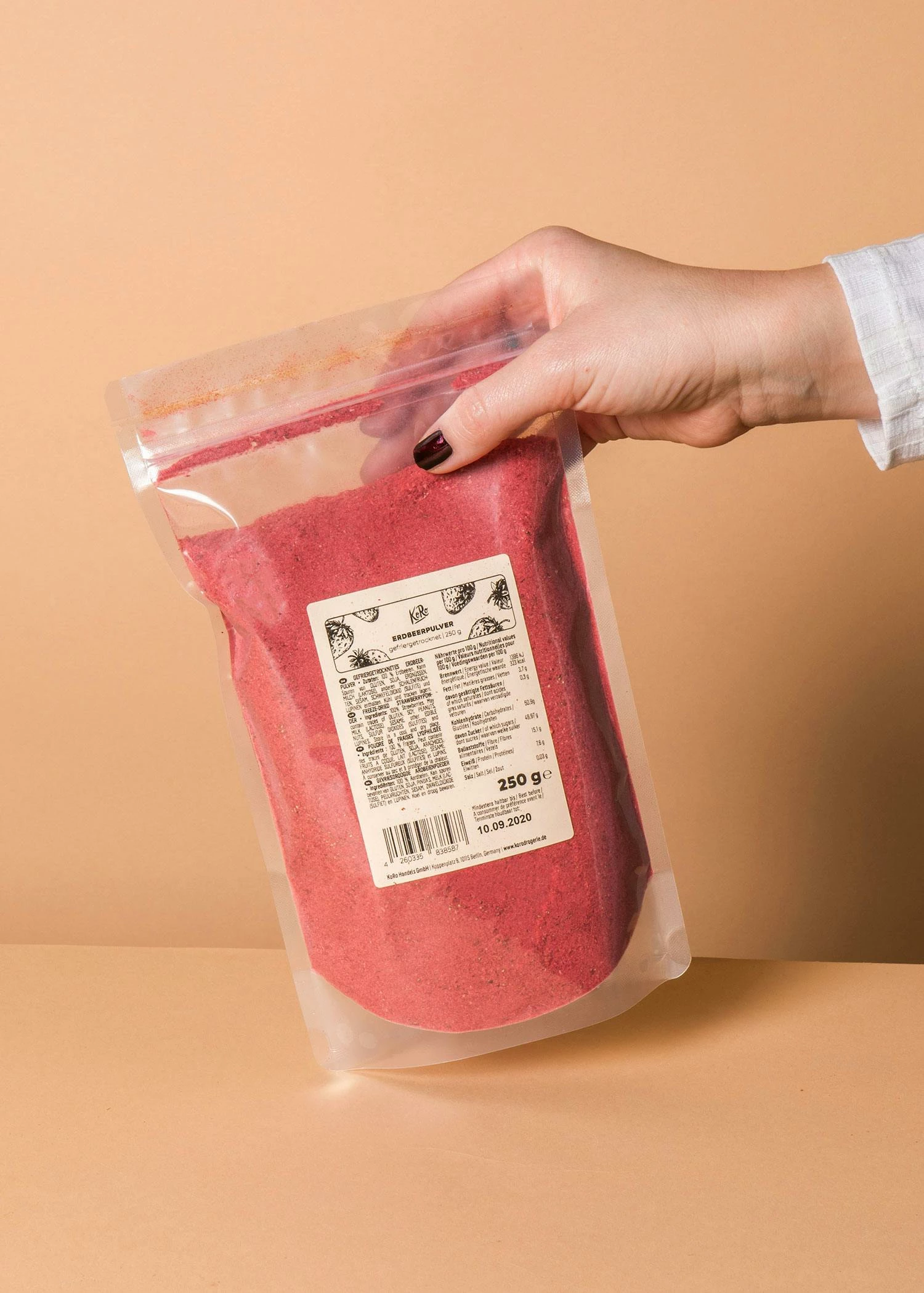 Sie sind rot, sie sind fruchtig, sie schmecken herrlich und sind für Dich ab jetzt 24/7 verfügbar – gefriergetrocknete Erdbeeren in Pulverform! Das Fruchtpulver aus 100 % Erdbeeren bereichert Deine Smoothie-Bowls und Cupcakes, veredelt Pralinen oder kann in selbstgemachter Schokolade punkten. Hole Dir den Sommer ganzjährig nach Hause und bestelle jetzt unser gefriergetrocknetes Erdbeerpulver!