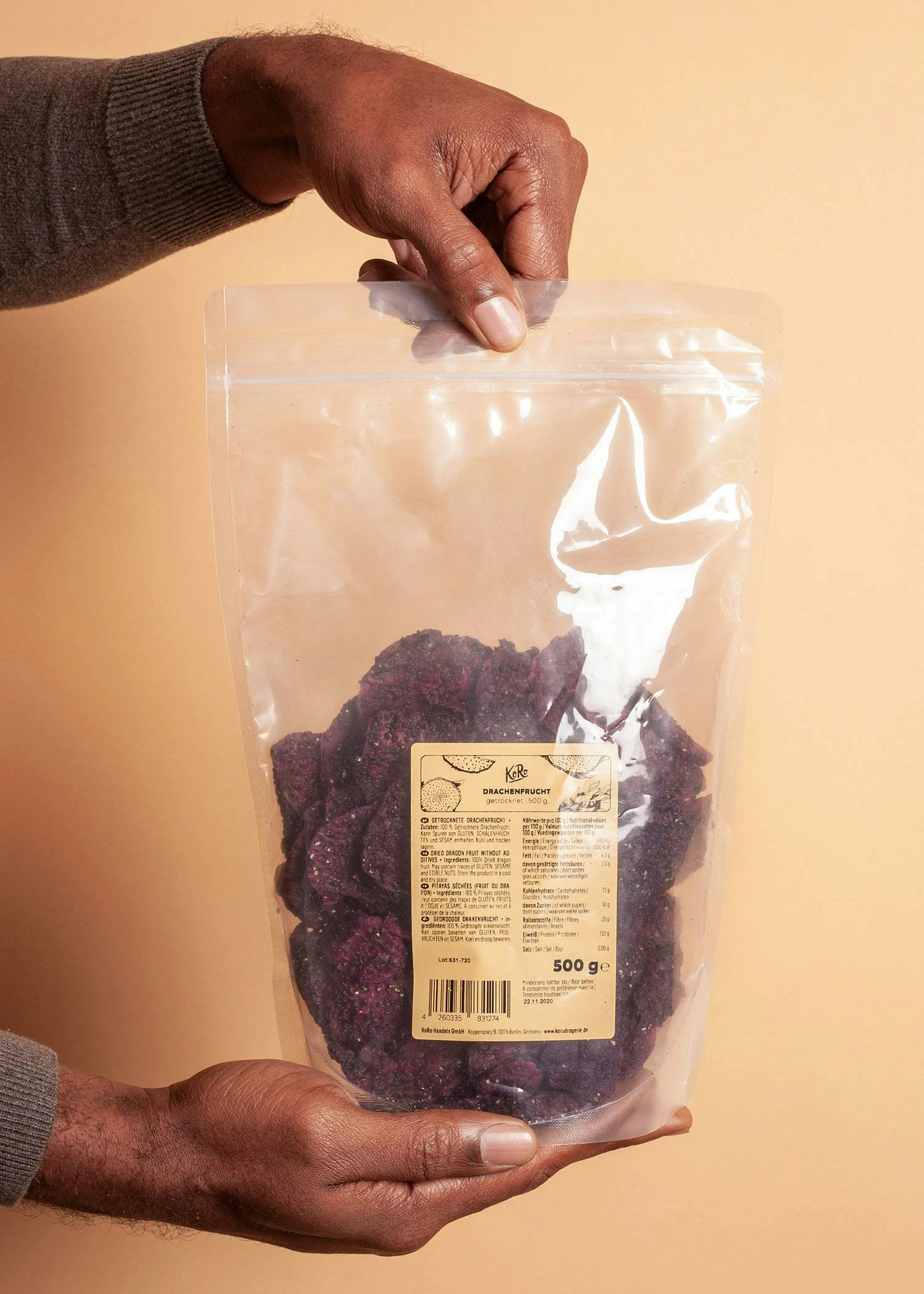 Du möchtest wissen, was Dich erwartet? Na dann, los: Der erste Biss in die violette, getrocknete Drachenfrucht beginnt mit einer knusprigen Schale und und endet mit einem weichen Kern. Erst erfrischend fruchtig, dann mild-süß – so beschreiben wir unser erstes Date mit der tropischen Frucht. Beim zweiten Date, hat sie uns ihre inneren Werten eröffnet und wir waren endgültig verliebt: Mit 20 g Ballaststoffe auf 100 g hat unsere violette Schönheit einen hohen Ballaststoffgehalt. Sie schmeckt dank der schonenden Trocknung himmlisch süß und fruchtig und das ganz ohne jegliche Zusätze – einfach 100 % purer Fruchtgenuss. Dir läuft schon das Wasser im Mund zusammen? Wir haben die Lösung parat: Bestelle Dir ganz einfach Deine Portion getrocknete Drachenfrucht und erlebe tropische Geschmackserlebnisse von Deiner Couch aus!