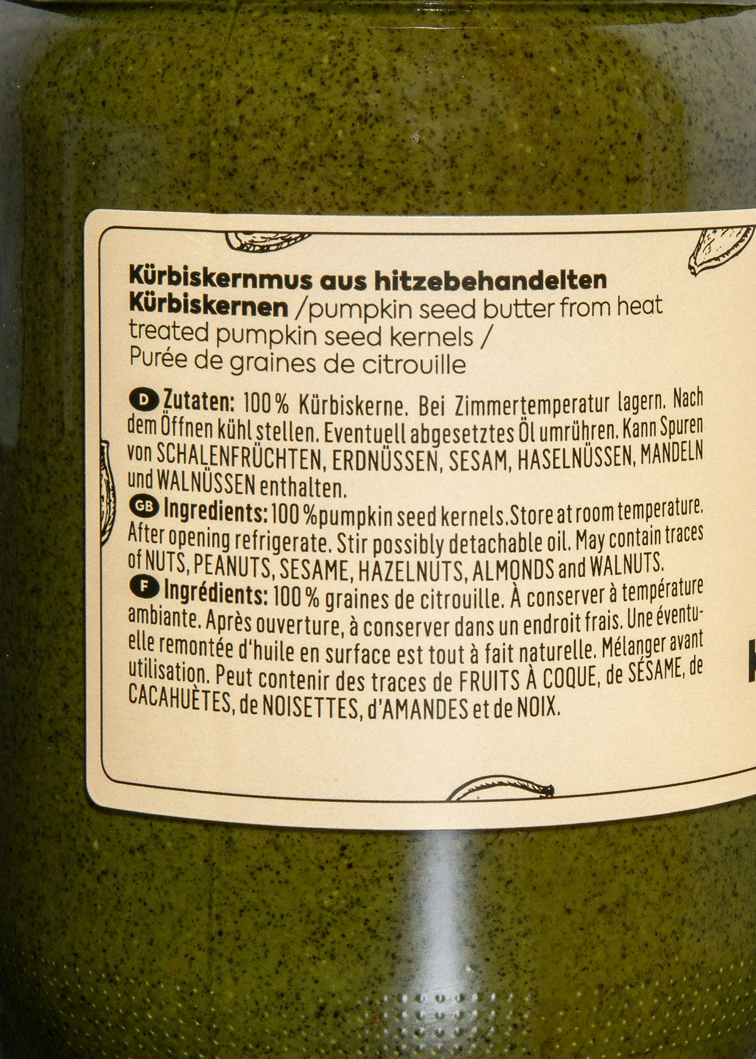 Wie der Großteil unserer Nussmuse punktet auch unser Kürbiskernmus mit vielfältigen Verwendungsmöglichkeiten: Durch seine leicht herbe Note eignet sich das Mus aus gerösteten Kürbiskernen perfekt für herzhafte Gerichte – egal ob in Soßen, Dips und Dressings, im Salat oder als veganer Nussaufstrich aufs Brot. Sogar in Kombination mit Nudeln schmeckt unser Kürbiskernmus köstlich (und qualifiziert sich als würdiger Pesto-Ersatz für das schnelle Mittagessen). Aber auch alle süßen Schleckermäulchen kommen nicht zu kurz: Auf Porridge, Smoothie Bowls, Müslis, Joghurt oder im Kuchen macht sich unser Kürbiskernmus ebenfalls wunderbar! Mal ganz abgesehen von seiner Multitasking-Fähigkeit sieht so ein verführerischer dunkelgrüner Klecks im Essen auch einfach echt professionell aus. Auf einer Skala von 1 bis 10 wird mit unserem Kürbiskernmus garantiert jedes Gericht – optisch und geschmacklich – zu einer 12!