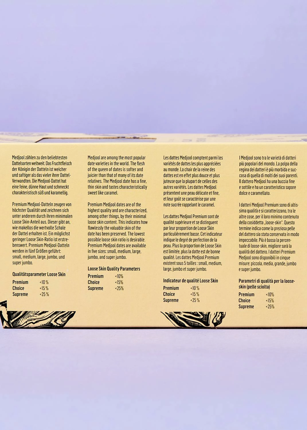Warum wir so begeistert von Medjool Datteln sind? Der Unterschied zu herkömmlichen Datteln liegt zunächst in der Konsistenz. Ihr Fruchtfleisch ist deutlich weicher und saftiger als das anderer Dattel-Sorten und ihre Haut wesentlich dünner – im Mund fühlt sie sich deshalb fast cremig an! Auch ihr Geschmack hebt die “Königin der Datteln” von den anderen ab, denn ihre unverwechselbare, natürliche Süße erinnert an leckeres Karamell. In unserem großen Dattel-Sortiment findest Du allerdings die verschiedensten Sorten und Größen – schau Dich gerne mal um!