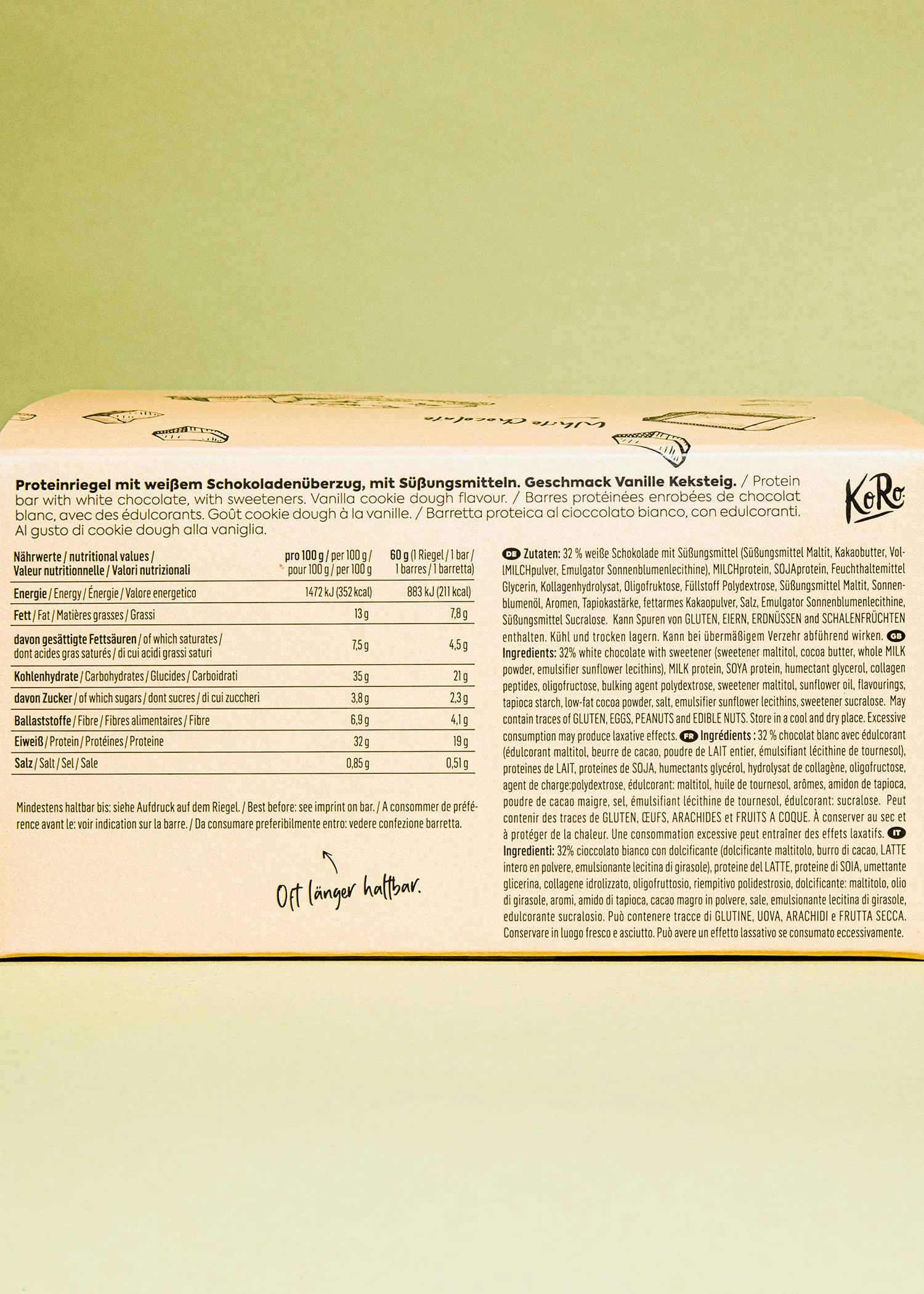 Die Proteinriegel haben es in sich: Vollgepackt mit einem Eiweißgehalt von 32 % helfen Dir unsere Riegel dabei, Deine Tagesdosis Eiweiß etwas leichter zu decken. Dafür wollten wir beim Geschmack keine Kompromisse eingehen: Unser Cookie-Proteinriegel mit weißem Schokoladenüberzug schmeckt nach weißer Schokolade und Vanille-Kuchenteig. Unter der zartschmelzenden Hülle aus weißer Schokolade wartet eine fudge-artige Konsistenz darauf, von Dir vernascht zu werden. Dabei verzichten wir auf raffinierten Zucker und setzen stattdessen auf Süßungsmittel*.