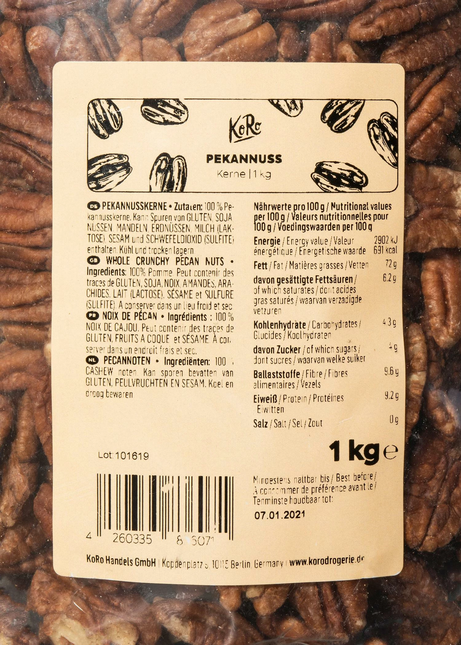 Unsere Pekannusskerne kommen aus ihrer Heimat,den USA, und in top Qualität zu Dir nach Hause. Mit ihrer hellbraunen und bernsteinfarbenen Farbe ist die Pekannuss der absolute Hingucker in jeder Nuss-Sammlung. Mit 9,6 g Ballaststoffen auf 100 g hat die Pekannuss einen hohen Ballaststoffgehalt und überzeugt so auch mit ihren inneren Werten. Hast Du die Nuss einmal probiert und schon willst Du die Pekannusskerne überall mit einbringen – dafür müssen wir keine Hellseher sein. Deshalb haben wir vorgesorgt und Du bekommst bei uns 1 kg pure Nusskraft. Probier Dich durch, veredele Deinen Nuss-Vorrat und kaufe jetzt unsere Pekannusskerne!