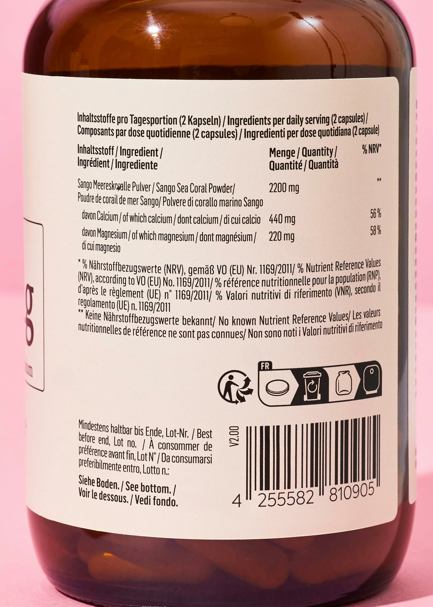 Hinweis: Unsere Sango-Meereskoralle-Kapseln dienen nicht als Ersatz für eine ausgewogene Ernährung und einen bewussten Lifestyle. Vielmehr stellen sie eine Ergänzung dar. Die Kapseln sind nicht für Kinder geeignet. Bewahre die Kapseln so auf, dass sie nicht in Kinderhände gelangen können.