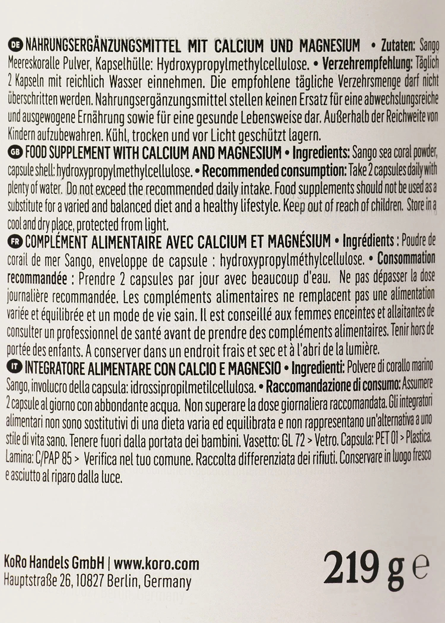In unseren Kapseln steckt nur Calcium und Magnesium, das bedeutet, sie werden ohne Füll-, Farb- und Aromastoffe hergestellt und sind frei von Fließ- und Trennmitteln. Wir empfehlen täglich zwei Kapseln unzerkaut mit reichlich Wasser einzunehmen. Denn so deckst Du 56 % Deines täglichen Calciumbedarfs und 58 % Deines täglichen Magnesiumbedarfs! Außerdem kommt das Nahrungsergänzungsmittel in einer edlen Braunglasverpackung zu Dir. In unserem Shop findest Du noch weitere Supplemente in praktischen Vorratspackungen, wie zum Beispiel unsere veganen Omega-3-Kapseln oder unser Bio-Chlorellapulver. Bestelle jetzt unsere Sango-Meereskoralle-Kapseln und halte schon nach wenigen Tagen Deinen 3-Monatsvorrat in Deinen Händen!
