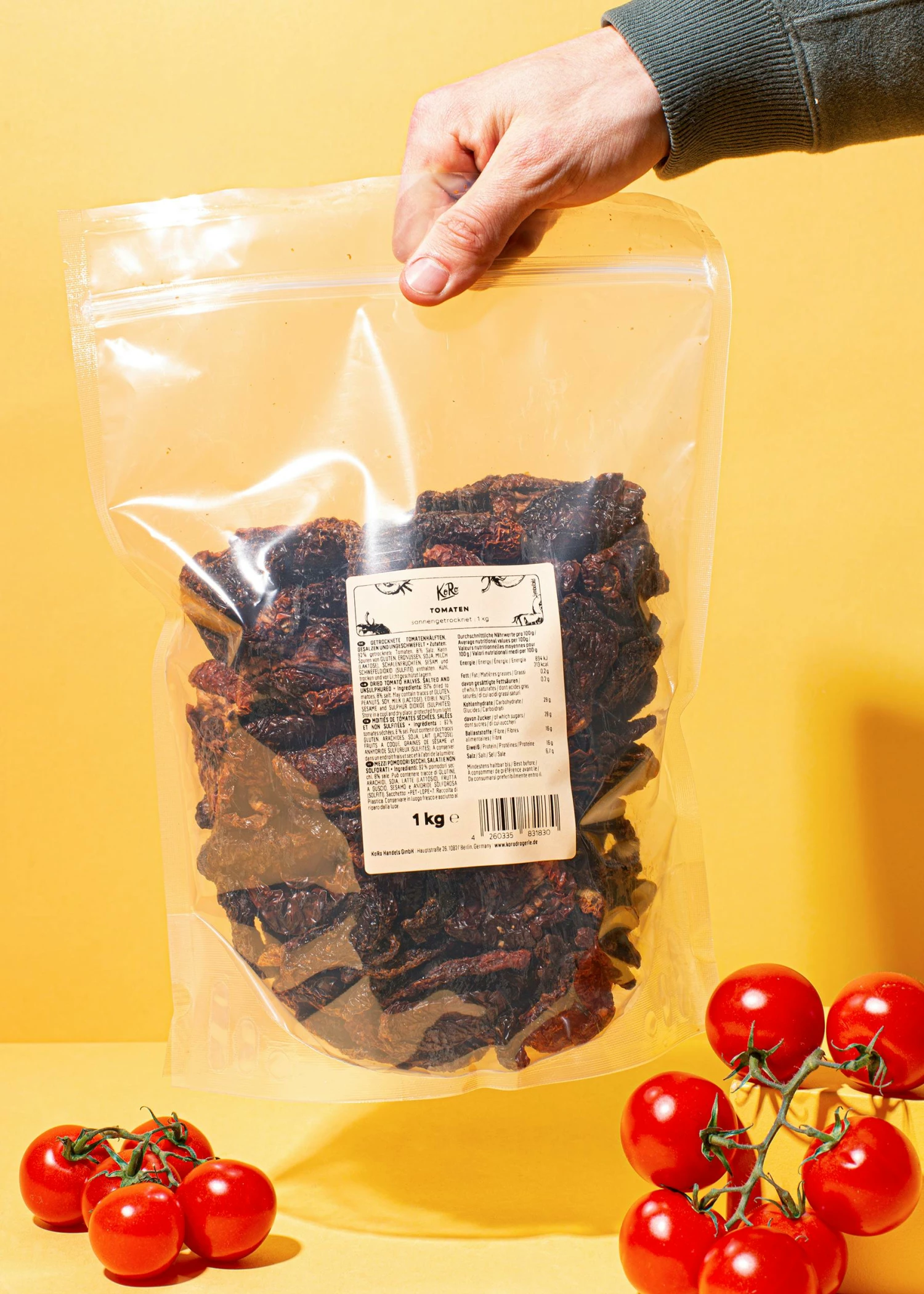 Ein Gefühl von Bella Italia auf Deiner Zunge – genauso schmecken unsere sonnengetrockneten Tomaten. Das rote Nachtschattengewächs, das rein botanisch gesehen zu den Beeren gehört, liebt Sonne. Und wir ihr Aroma. Deswegen wollen wir dieses besonders lange konservieren. Damit wir und Du rund um die Uhr vom tomatigen Genuss der sonnengetrockneten Tomaten profitieren, haben wir unsere Tomaten schonend getrocknet, dadurch haltbar gemacht und im 1-kg-Vorratspack für Dich im Shop bereitgestellt. Jetzt musst Du nur noch zuschlagen: Jetzt unsere getrockneten Tomaten kaufen und Italien in die eigene Küche holen.