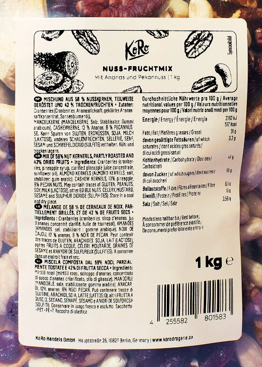 Nussig, fruchtig, salzig und süß – klingt nach einem bunten, aber ziemlich leckeren Cocktail, oder? Anders als bei manch anderen Cocktails musst Du hier nicht rätseln, was drin ist: Cashewkerne, Pekannüsse und geröstete und gesalzene Mandeln sowie getrocknete Cranberrys und getrocknete Ananas. Also genau die richtige Abwechslung, wenn Du ausnahmsweise mal keine Lust auf unser klassisches Studentenfutter oder die allseits beliebte KoRo-Probiermischung hast! Mit unserem Frucht-Nuss-Mix geben wir Dir nicht nur eine originelle Snack-Mischung, sondern auch eine leckere Ballaststoffquelle an die Hand. Und weil wir uns sicher sind, dass Du Dich Hals über Kopf in den köstlichen Mix aus salzig und süß verlieben wirst, kannst Du ihn gleich in der praktischen 1 kg-Vorteilspackung kaufen.