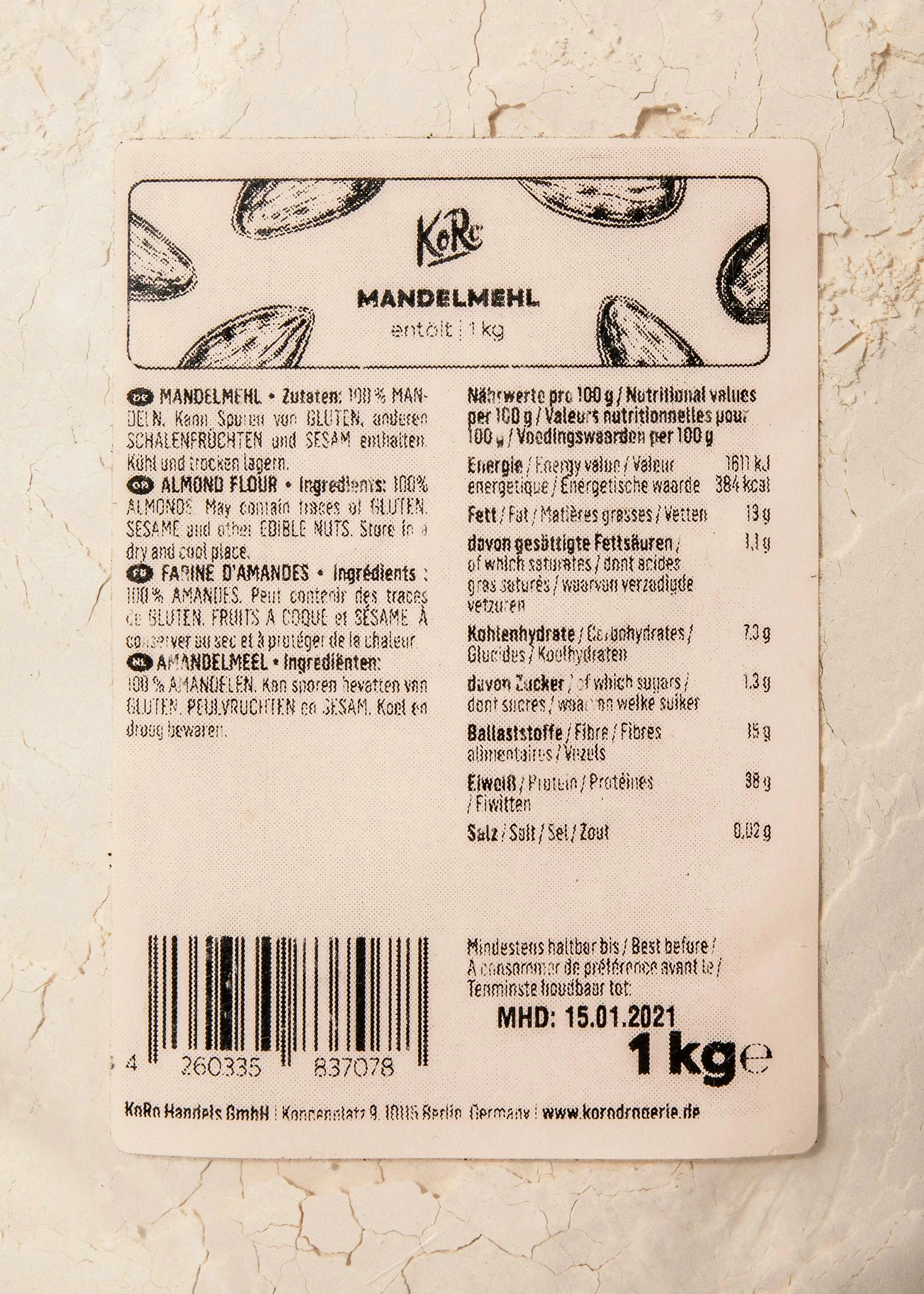 Unser Mandelmehl wird schonend aus blanchierten Mandeln hergestellt, die im Herstellungsprozess stark entölt werden. Dabei entsteht ein nussig-süßlich schmeckendes Mehl, das sich hervorragend zum Backen und Kochen eignet. Zu beachten ist allerdings, dass das Mehl nicht zu 100 % als Ersatz zu Weizenmehl verwendet werden kann. Oft ist es empfehlenswert nur circa 20 % des Weizenmehls durch Mandelmehl zu ersetzen. Da letzteres durch den hohen Ballaststoffgehalt mehr Flüssigkeit bindet, solltest Du auf eine entsprechende zusätzliche Zugabe von Flüssigkeit achten. Zu nass sollte der Teig allerdings auch nicht werden! Klingt in der Theorie vielleicht kompliziert, ist in der Praxis jedoch halb so schlimm und lohnt sich, denn Mandelmehl bereichert Deine Kreationen mit seiner aromatisch-nussigen Note.
