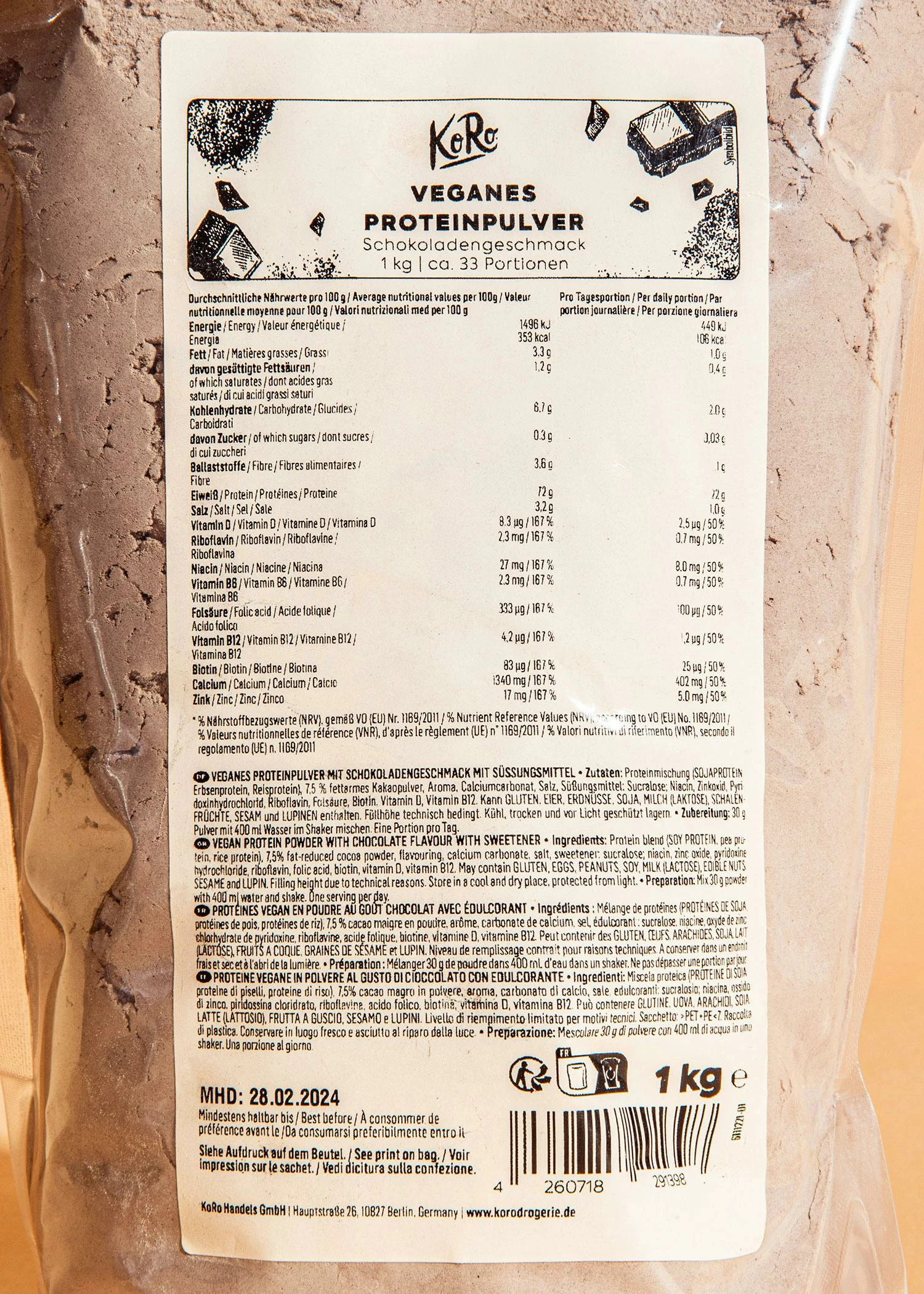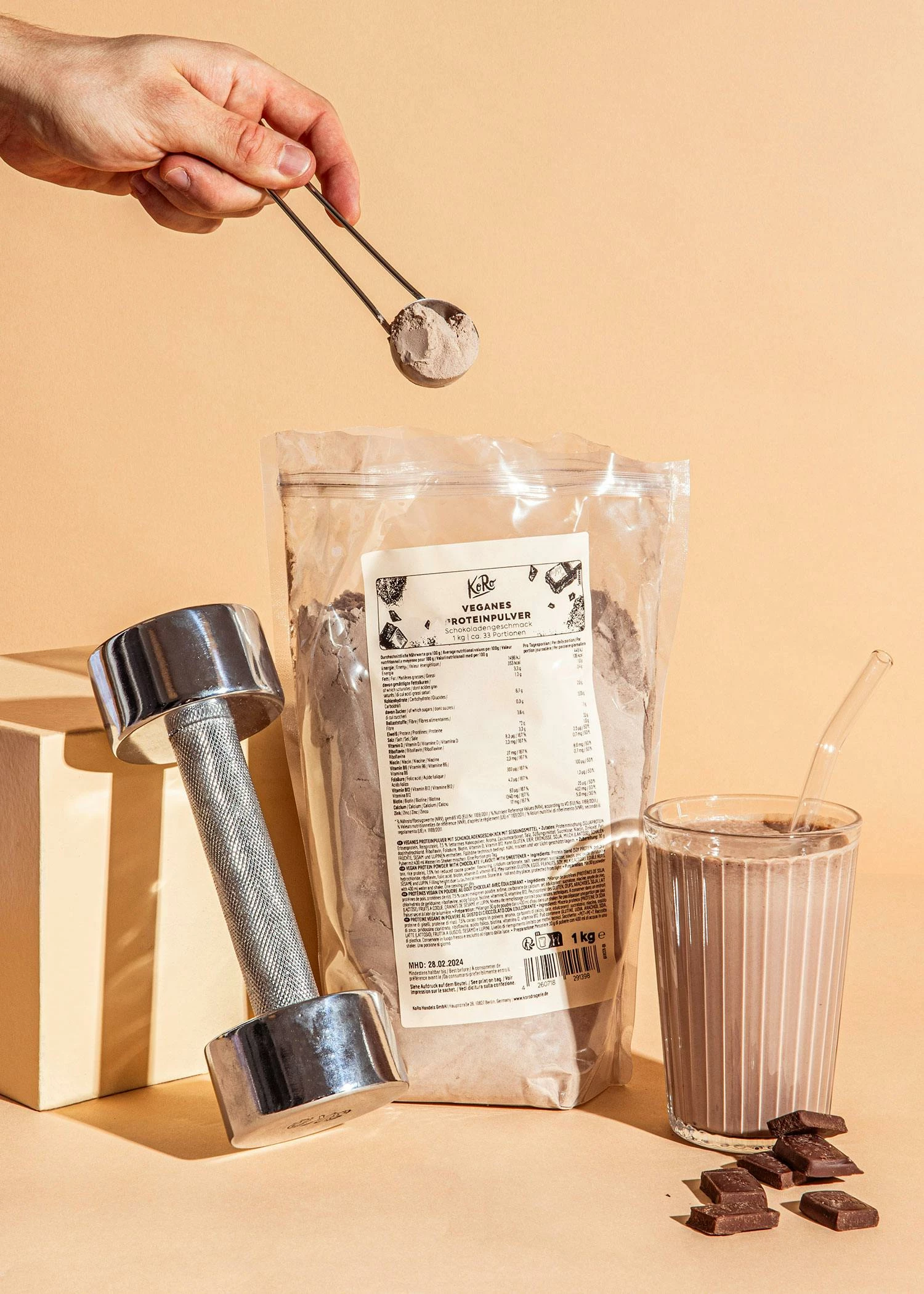 Von Salat schrumpft der Bizeps? Das mag vielleicht sein, von pflanzlichem Proteinpulver aber sicher nicht! Deshalb präsentieren wir Deinen Muckis hiermit feierlich: unser veganes Proteinpulver mit Schokoladen-Geschmack. Hier trifft cremig-süß auf eine ordentliche Ladung Protein. Mit ganzen 21,6 g Eiweiß pro Portion (30 g des Pulvers) bist Du also in jeder Lebenslage bestens ausgestattet. Egal, ob direkt nach einem anstrengenden Workout, in Dein Müsli gemischt oder als schneller Shake für zwischendurch – mit unserem veganen Schoko-Proteinpulver kommst Du immer auf Deine Kosten (bzw. Deinen Proteinbedarf). Schlag‘ jetzt zu und sichere Dir durch die praktische Vorteilspackung direkt 1 kg des angenehm-süßen und rein pflanzlichen Proteinpulvers.