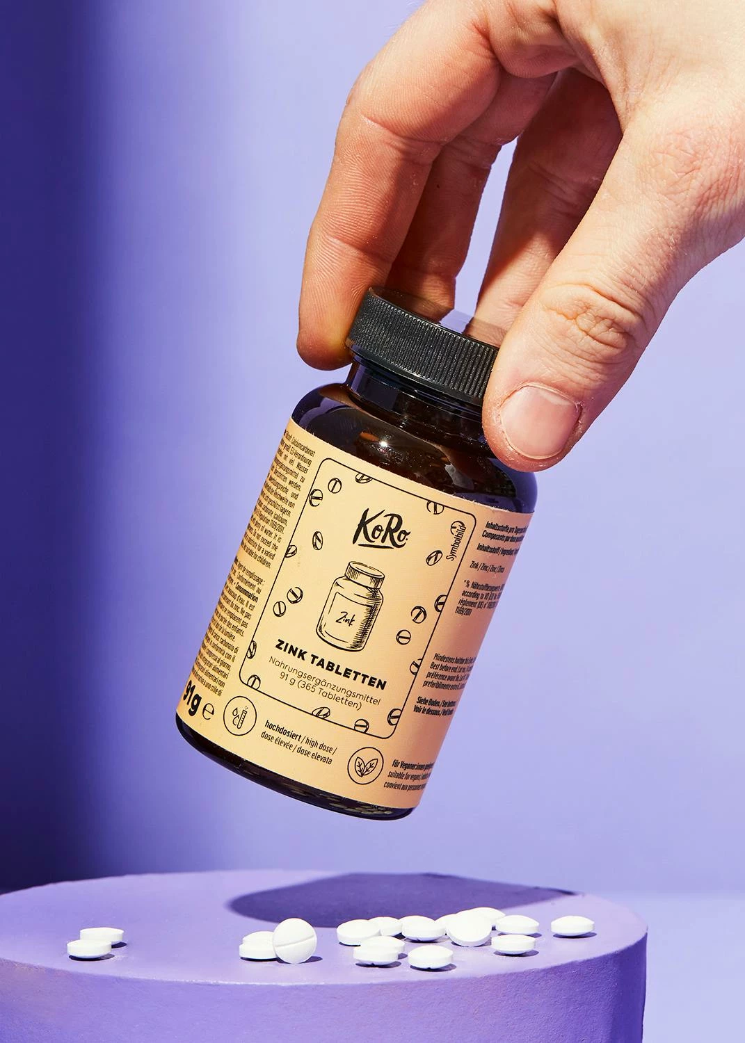 Um Dir die Bedeutung von Zink näherzubringen, nehmen wir Dich mit in eine kleine KoRo-Chemievorlesung! Zink zählt zu den sogenannten Spurenelementen. Das sind anorganische Bestandteile, deren Gehalt im Gewebe im Vergleich zu Mengenelementen (z. B. Calcium) geringer ist. Aber nicht nur das: In unserem Körper gibt es nicht die üblichen Speicherorgane für Zink. Daher muss Zink regelmäßig zugeführt werden, um einem Mangel vorzubeugen. Denn mit dem Element sind eine Reihe von wichtigen Funktionen verbunden. Allgemein trägt Zink zu einer normal kognitiven Funktion und zu einem normalen Kohlenhydrat-Stoffwechsel bei. Von Natur aus ist Zink übrigens in pflanzlichen Lebensmitteln wie Cashews und Pekannüsse sowie Weizen- oder Roggenkeimlingen enthalten. Auch mithilfe von tierischen Lebensmitteln wie Rind- und Schweinefleisch, Eiern, Käse und Milch lässt sich der Bedarf an Zink decken. So musst Du nicht zwingend auf unsere hochdosierten Tabletten zurückgreifen, sondern kannst Deine Zinkzufuhr auch über die genannten Lebensmittel decken. In bestimmten Lebensphasen oder bei einem Zinkmangel ist es aber auch empfehlenswert, auf Nahrungsergänzungsmittel zurückzugreifen. Beachten solltest Du, dass unsere Zink-Tabletten lediglich eine Nahrungsergänzung darstellen und kein Ersatz für eine ausgewogene und abwechslungsreiche Ernährung sind. Wenn Du gerade dabei bist, Dich mit Nahrungsergänzungsmitteln zu beschäftigen, dann schau doch mal bei unseren anderen Supplements vorbei. Dort findest Du beispielsweise auch Omega 3 Fischöl.